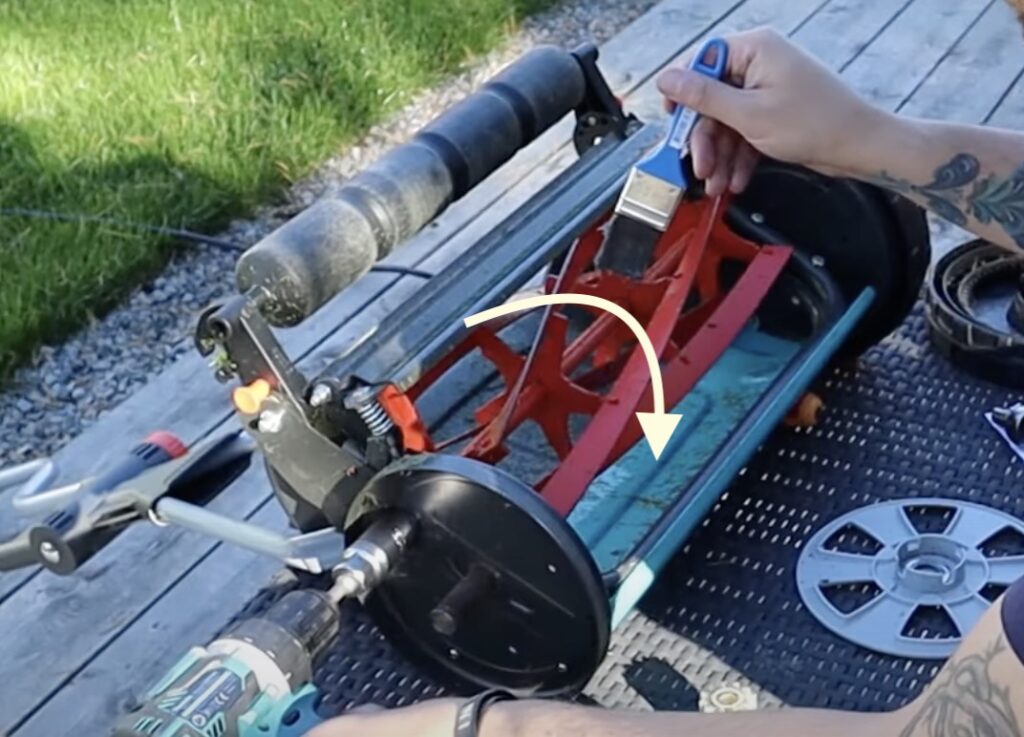 電ドルを噛ませてリール刃を芝刈りとは逆方向に回転させながら、コンパウンドをブラシで塗り付けながらラッピングします。