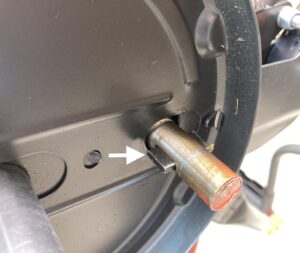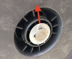 グレーのホイルキャップみたいなのを外すと車軸の端が見えるので、止め輪(ダルマ・クリップと言うらしいです)をラジオペンチなどで引き抜きます。