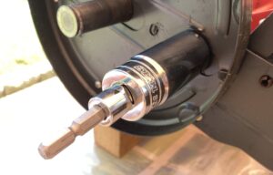 ソケットだけでは回した時のブレが大きいので、内径14mm (リール刃軸の径)、外径21mmのリング (プラスチック) を作ってソケットに嵌めています。